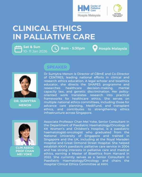Associate Professor Chan Mei Yoke, Senior Consultant in the Department of Paediatric Haematology/Oncology at KK Women’s and Children’s Hospital, is a paediatric haematologist-oncologist who graduated from the National University of Singapore and trained in Singapore and the UK, including at the Royal Marsden Hospital and Great Ormond Street Hospital. She helped establish KKH’s paediatric palliative care service in 2004 and has strong interests in palliative care and medical ethics, earning a Master of Bioethics from Harvard in 2022.
