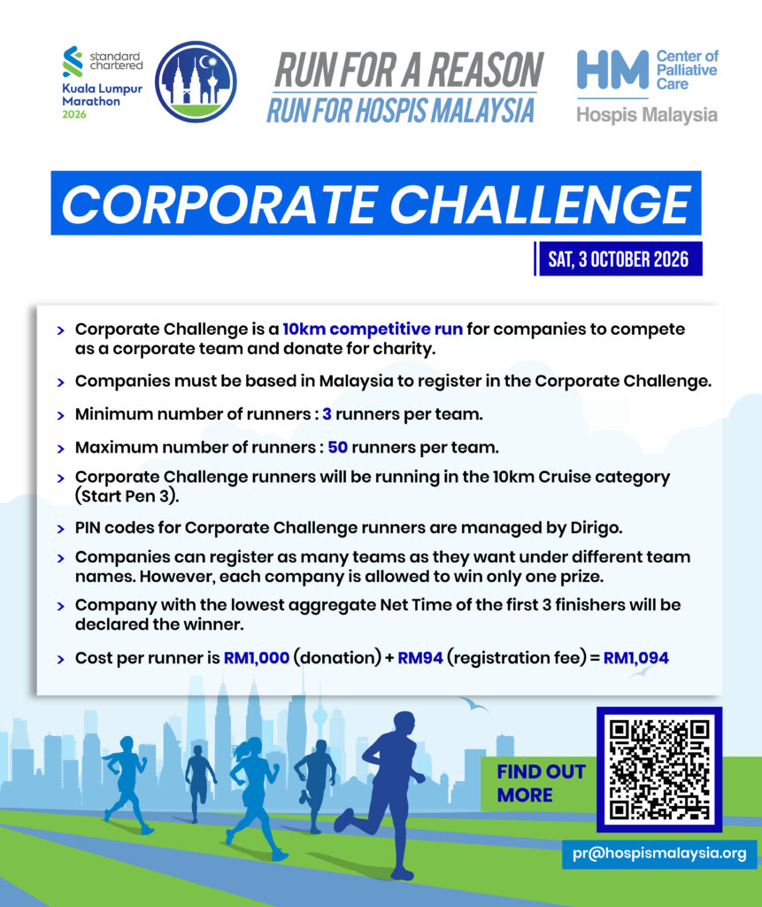 Join the Corporate Challenge HERE. Take part in the 10km Corporate Challenge with your colleagues, compete as a team, and raise funds for Hospis Malaysia.